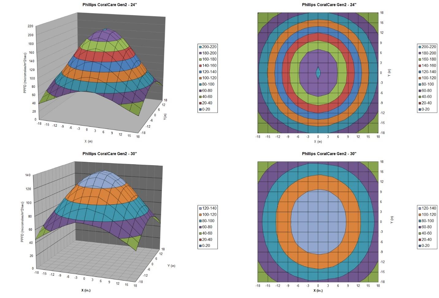 Figure 3 shows the spread and intensity as measured at the 169 points on the 3X3ft grid. Peak values obtained at 24” were 201.5 (?moles/m2/sec) , and 134 at 30”.