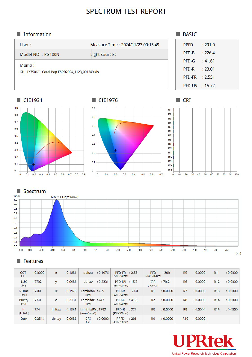 Figure 2 shows the spectrum analysis. The peak spectrum is at 447 nm. The spectral plot also shows the lumped PFD measurements for Blue, Green, Red, UV and Far Red. The color coordinates are also indicated in the CIE diagrams as color coordinates.