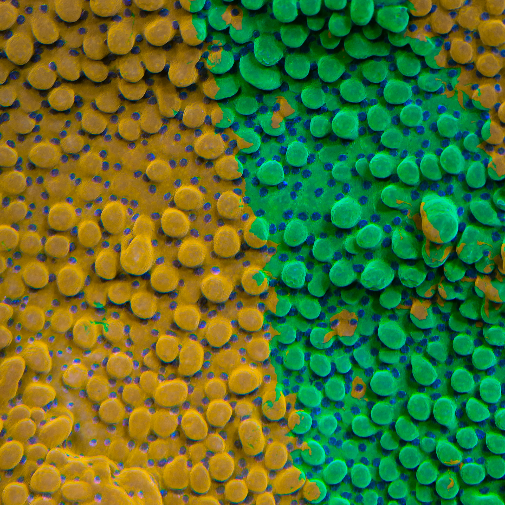 Contrary to the term’s horticultural origins, coral grafting is not the physical joining of two different coral species. Instead, it describes a spontaneous process where fluorescent protein pigments appear to transfer from one coral to another. This can result in two colors swirling and mixing on the same colony or even the creation of a third color in the merged area. In extremely rare cases, sometimes multiple new base color pigments occur, like our multiple triple base color grafts which started from completely different parts of the same colonies or even different ones