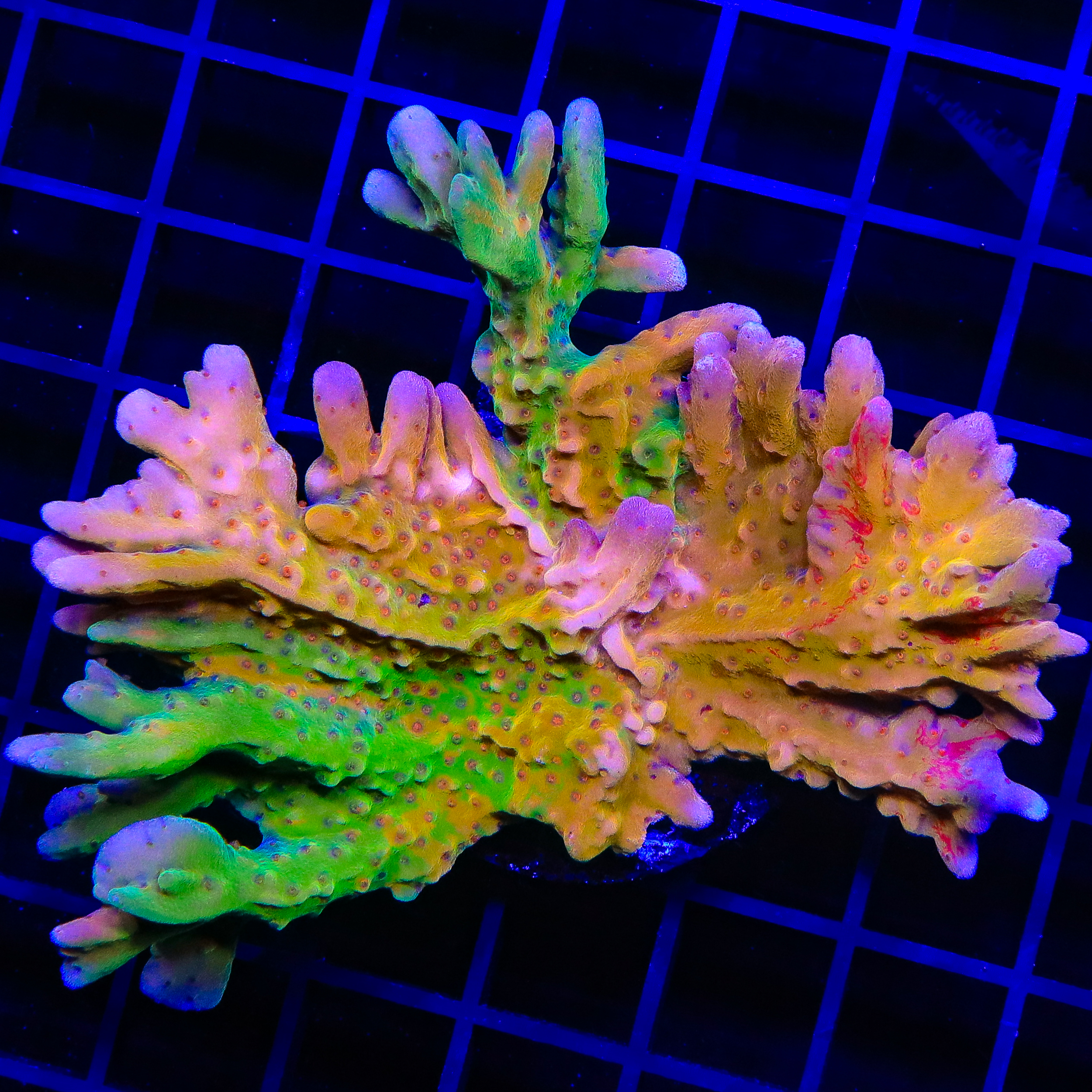 With a striking gradient of lime green, yellow, gold, and pink, topped with reddish-orange polyps, this coral embodies the full spectrum of SPS coloration.