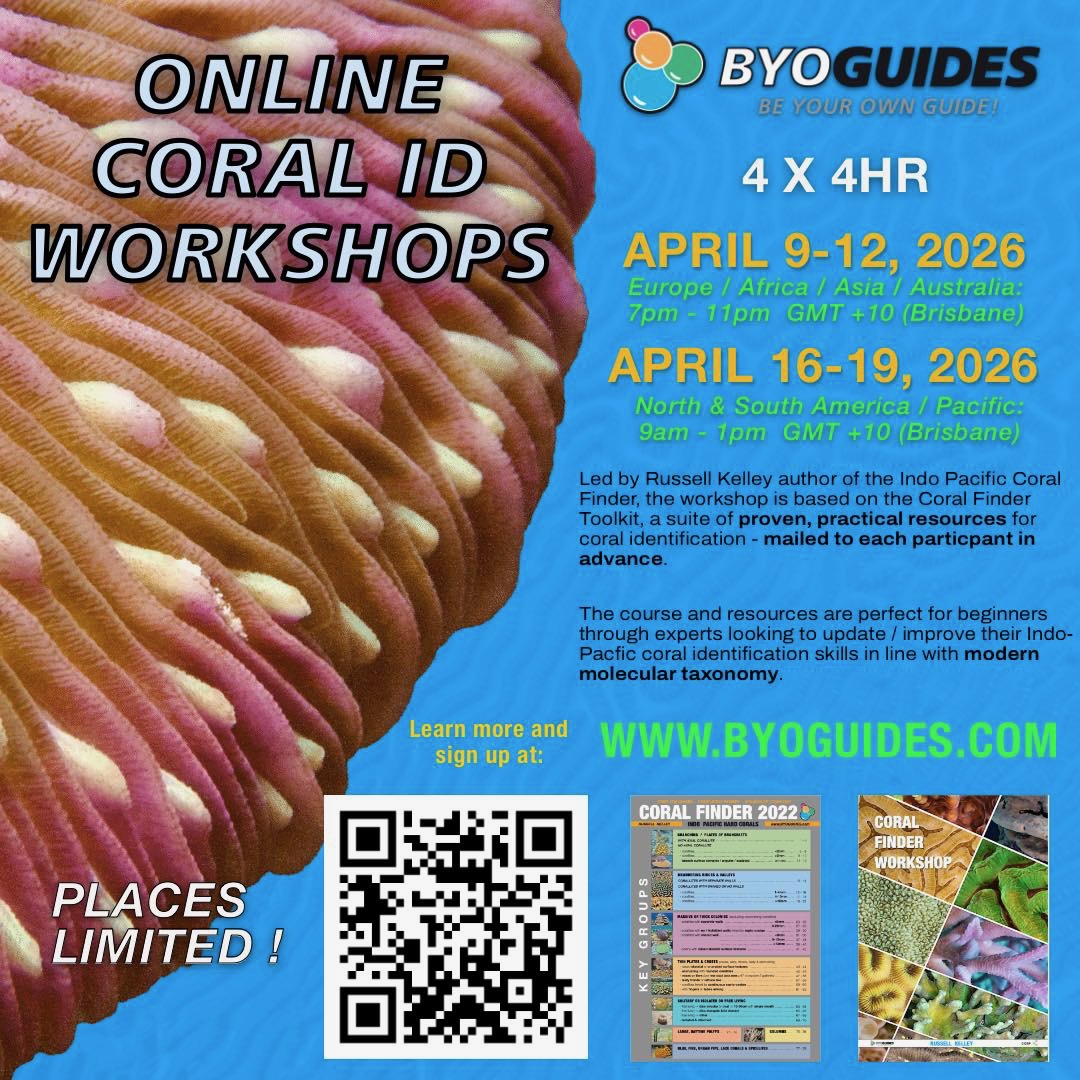 Russel Kelly has created an iconic set of Be Your Own (BYO) Guides which serve as a reference for coral and critter identification. His workshops provide a deep dive in using the guides along with the latest updates on coral ID and nomenclature through a series of interactive on-line sessions.