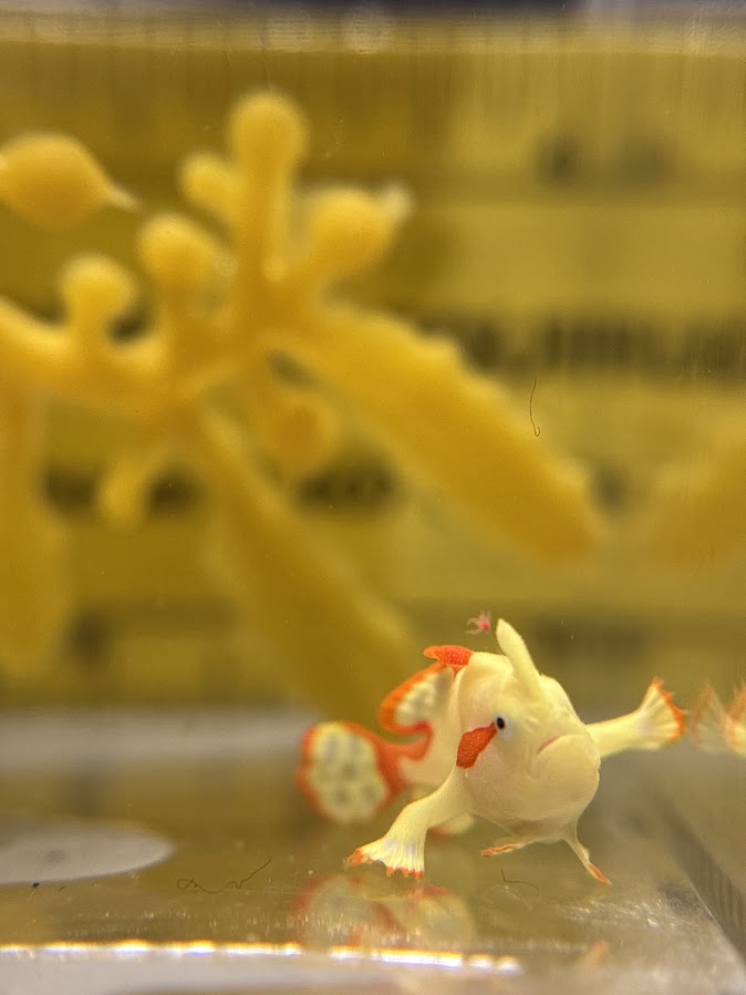The journey for this lone warty frogfish began in September 2025 when animal caretakers at Shedd were surprised to find a gelatinous egg mass floating in the habitat of two warty frogfish in Wild Reef. The caretakers carefully moved the egg mass to a special habitat behind the scenes and kept a close eye as the eggs hatched into thousands of larvae.
