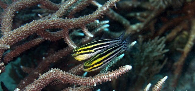 Look at this amazing pair of Meiacanthus grammistes. Eh hmm…wait a minute. That’s not quite right. Look closer. Cardinal fish? Bingo. This is a pair of Cheilodipterus nigrotaeniatus and they are excellent mimics…