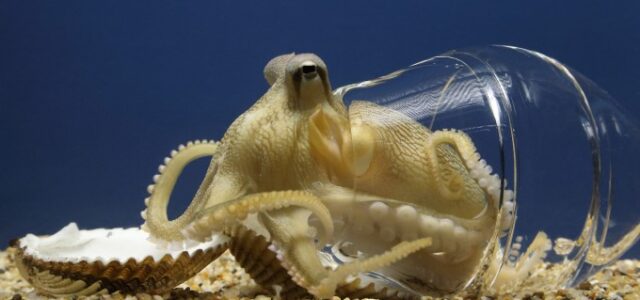 Coconut octopus making itself at home at the Monterey Bay Aquarium